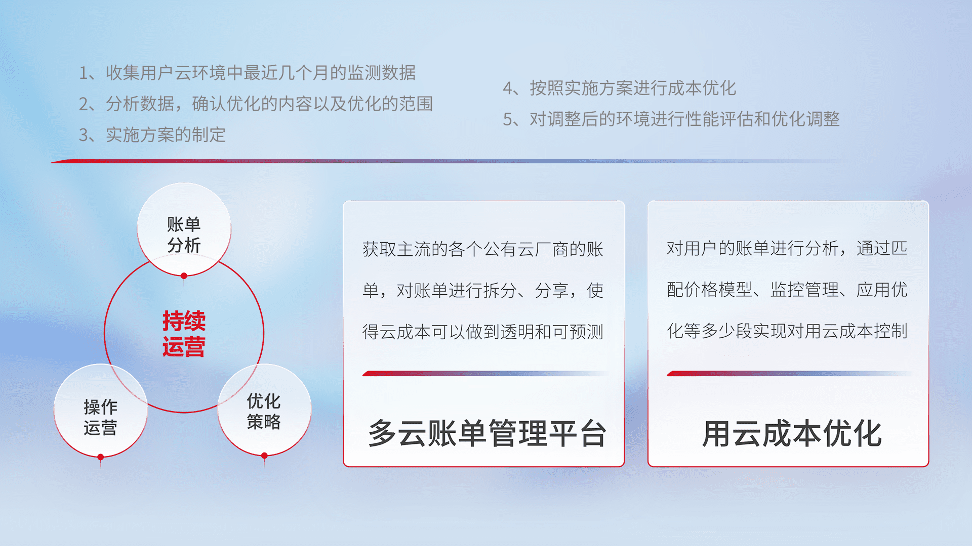 通过多云纳管,,,,以统一的资源数据模型把客户的云资源进行抽象和封装,,,进而实现对多云资源的统一操作,,,,保障云资源管理的可靠性、、稳定性与可用性。。量身定制化运维内容,,,,配置、、、、开发运维、、补丁管理、、备份、、、监控、、、认证和访问管理、、、审计和日常巡检等,,,保障在用云过程中的可靠度,,,,稳定度以及高可用率。。